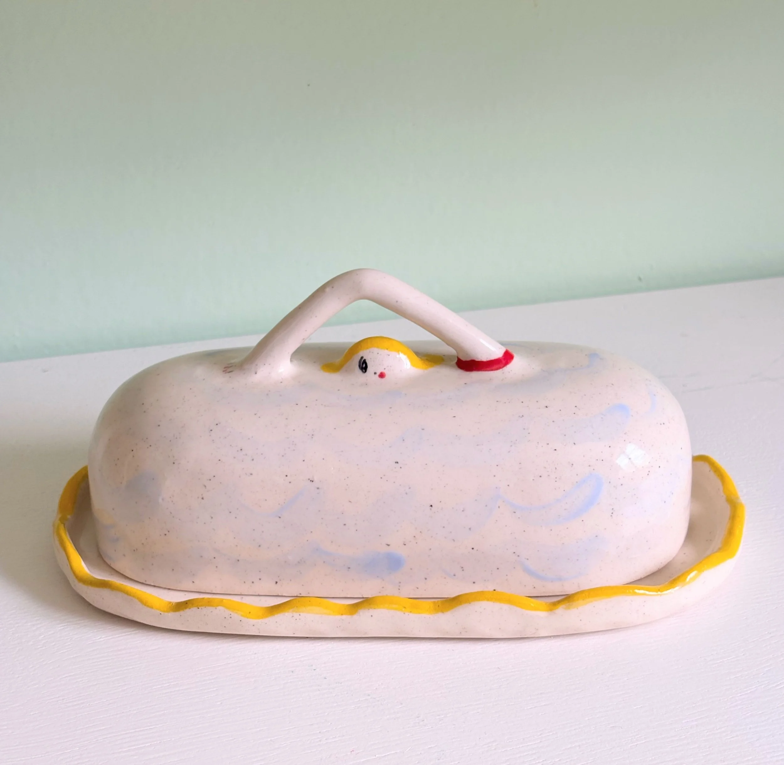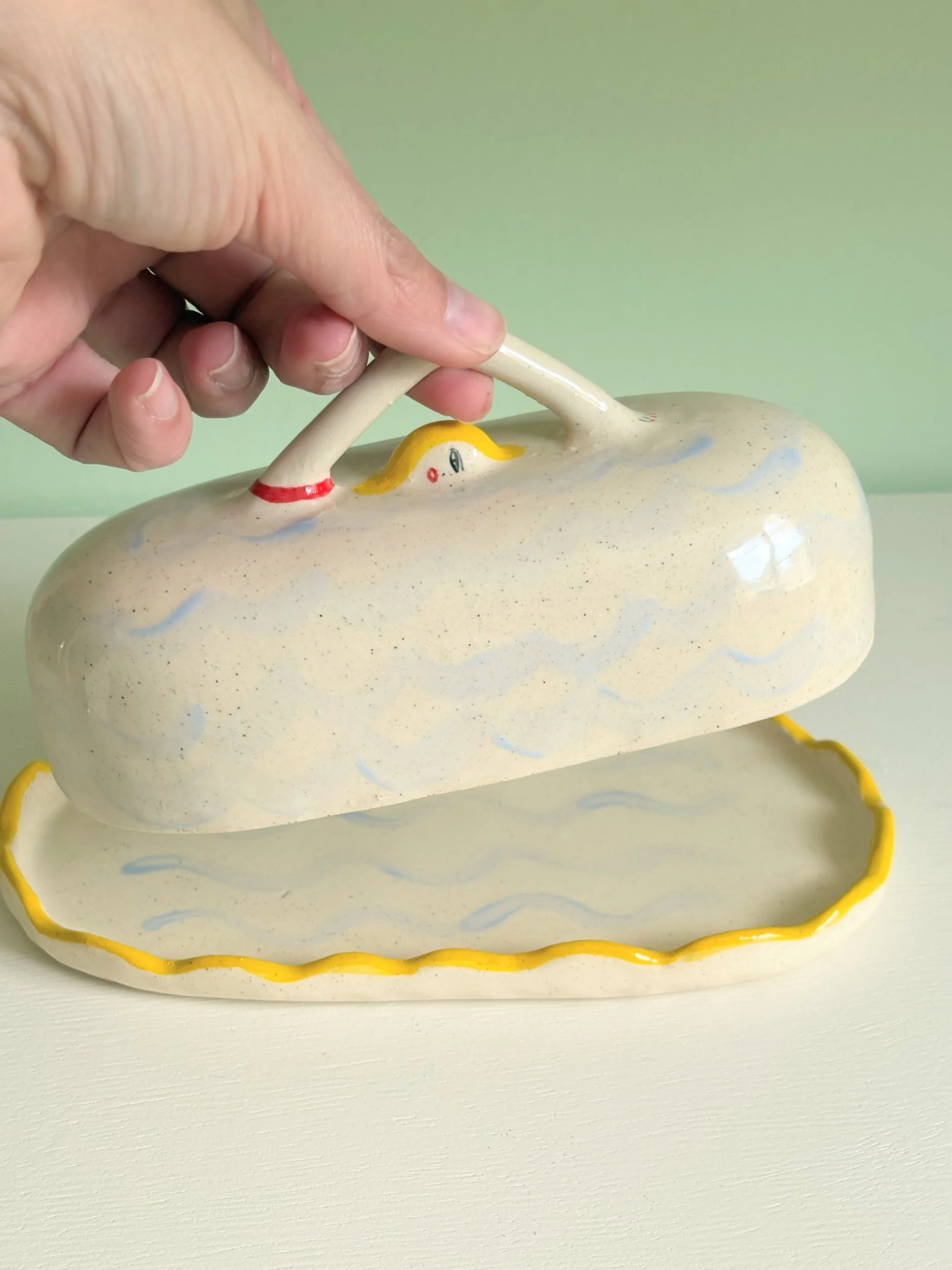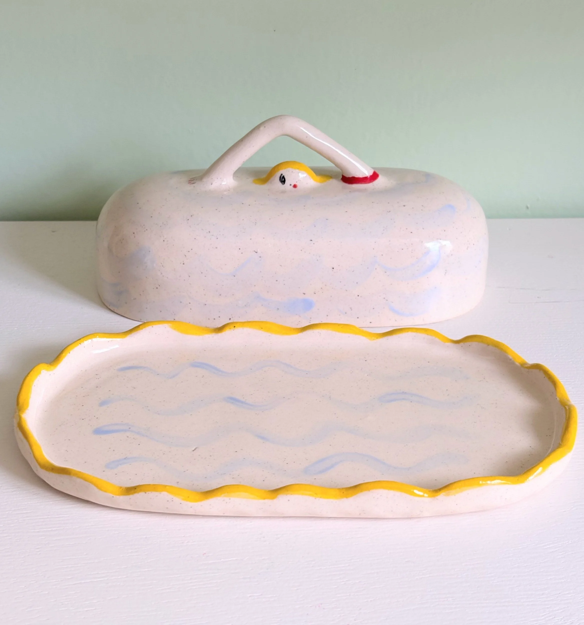 shop › Swimming in butter dish! Image 1 of 3 Image 2 of 3 Image 3 of 3 Swimming in butter dish! $130.00 Hand pinched butter dish featuring a two sided blonde swimmer.Top- 6.6” long x 3 2/4Bottom tray- 7.5” x 4 2/4” Add To Cart Added! Hand pinched butter dish featuring a two sided blonde swimmer.Top- 6.6” long x 3 2/4Bottom tray- 7.5” x 4 2/4”