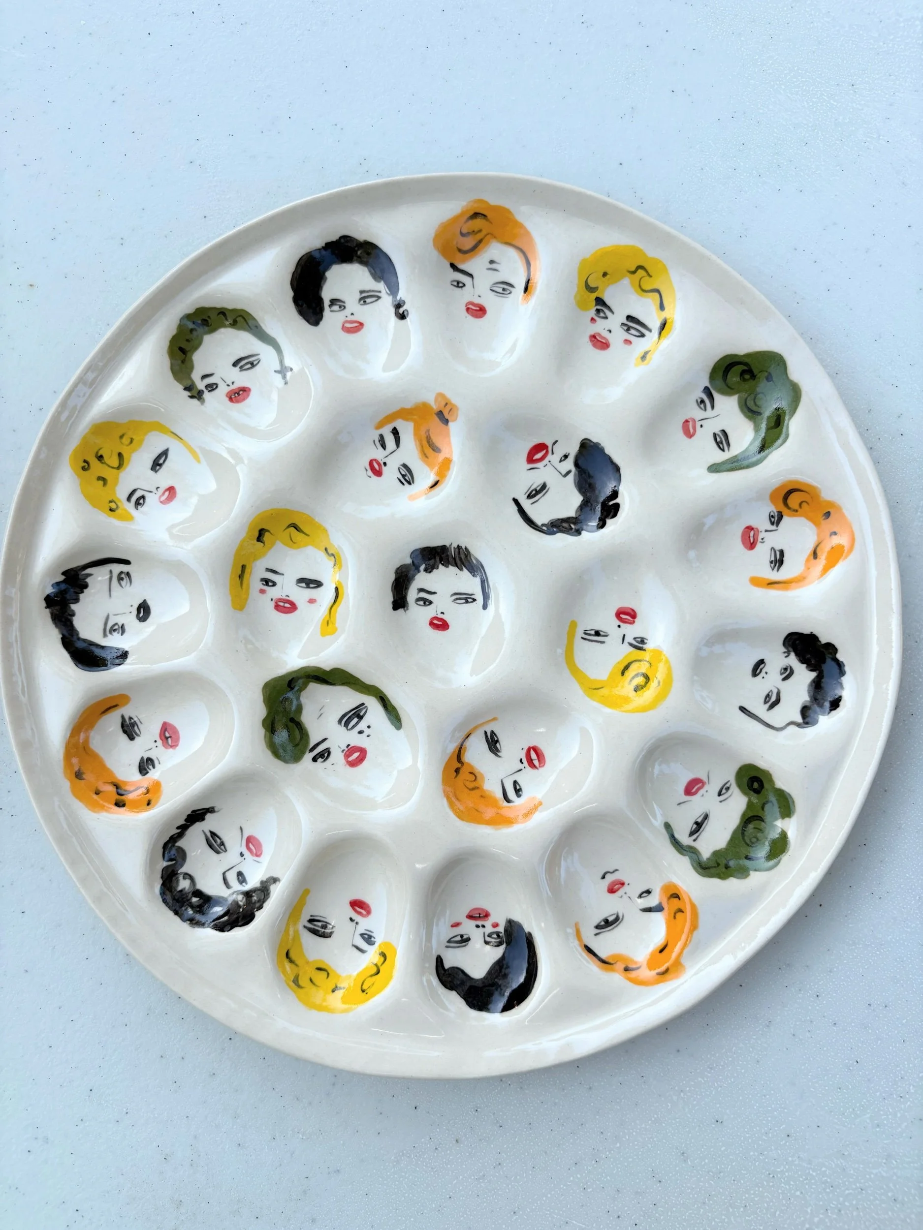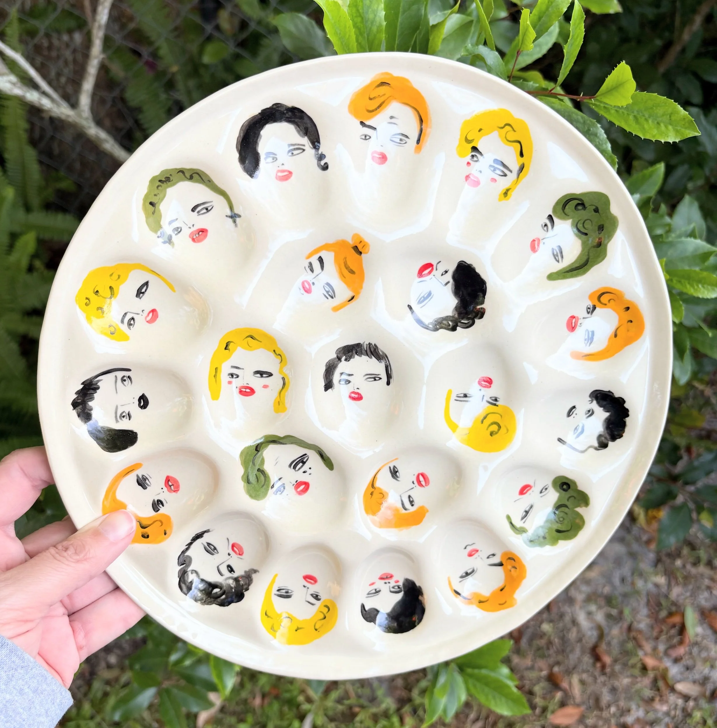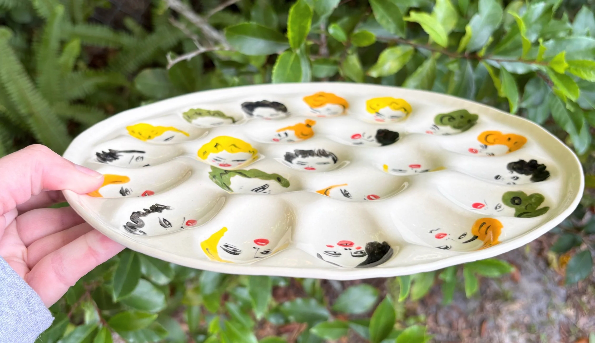 Hand built and painted deviled egg tray! A nice surprise under each bite!