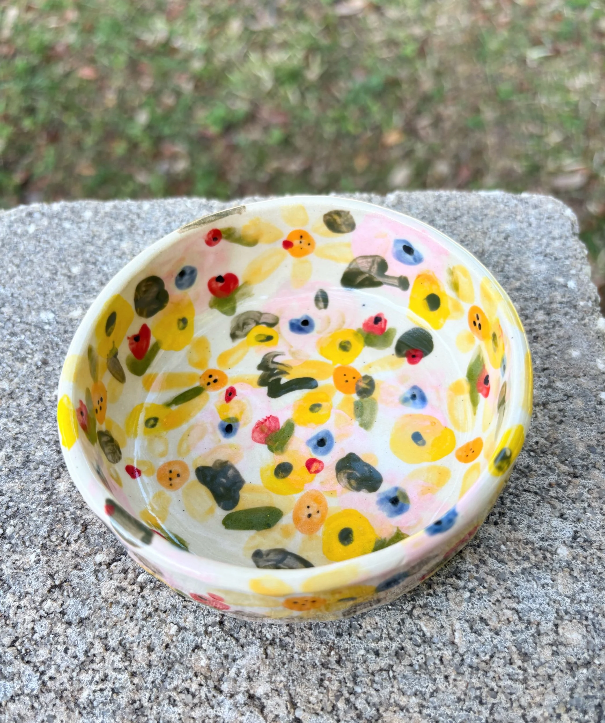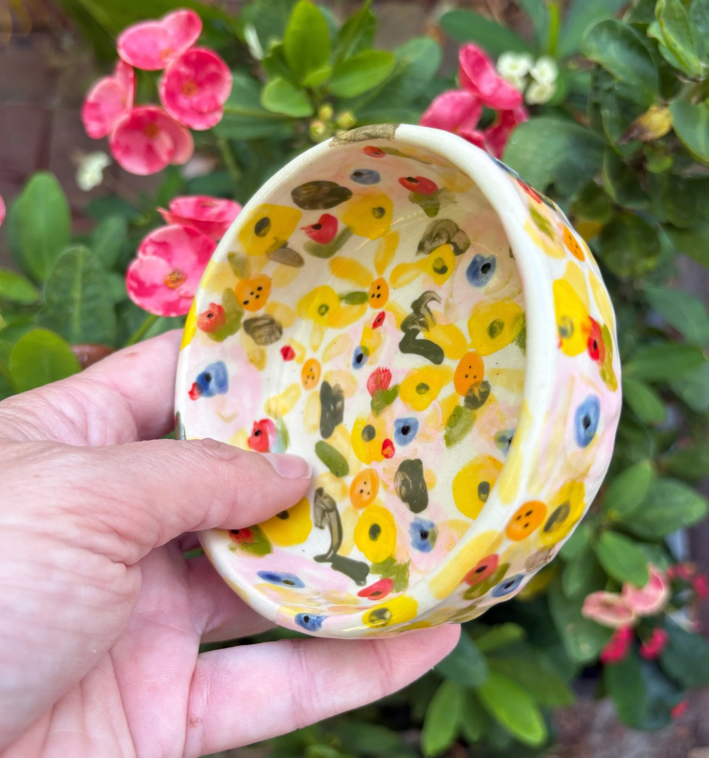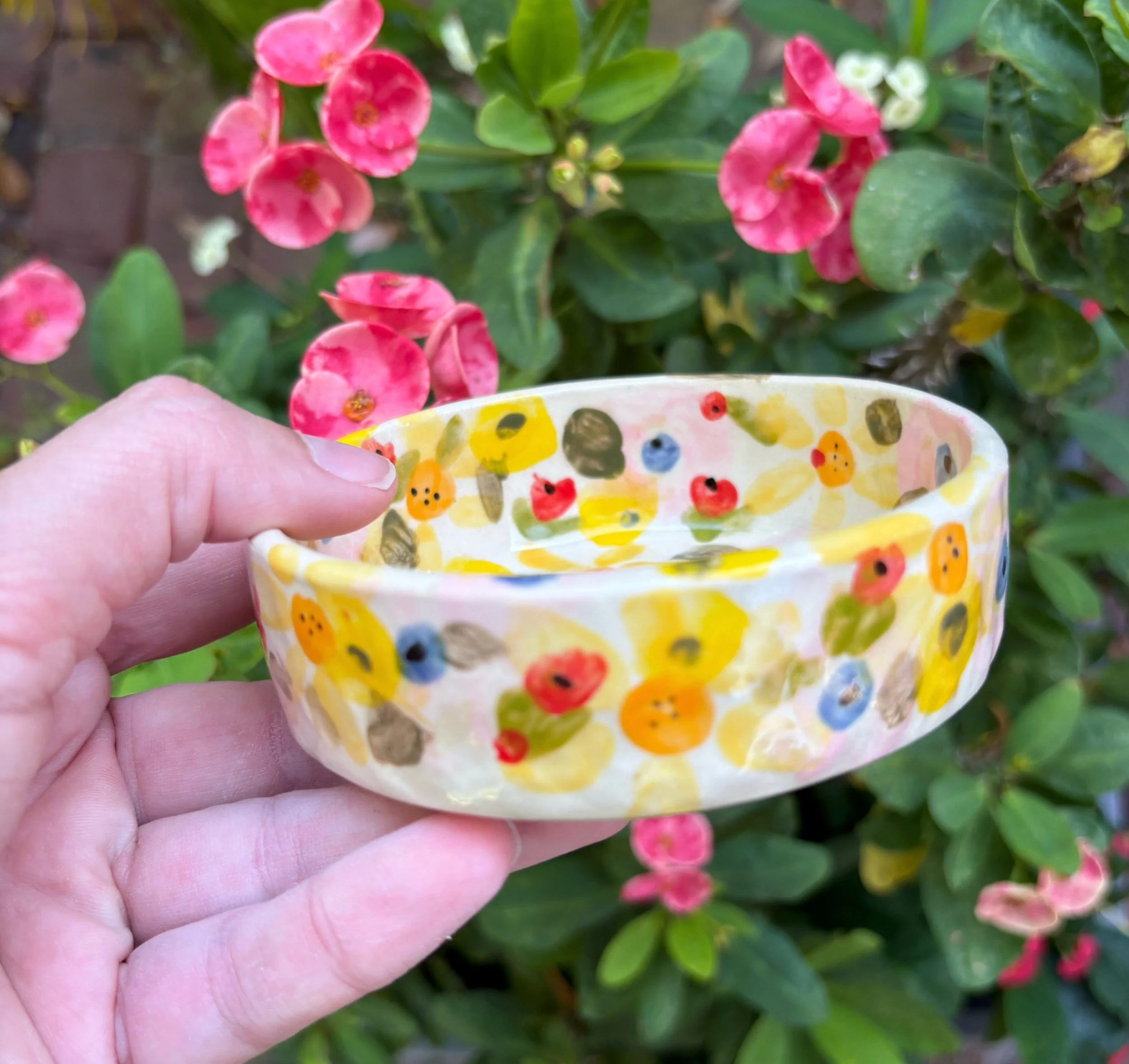 Hand built floral ramekin. Can hold a standard bottle of wine as a wine coaster or fill with snacks for your charcuterie board!