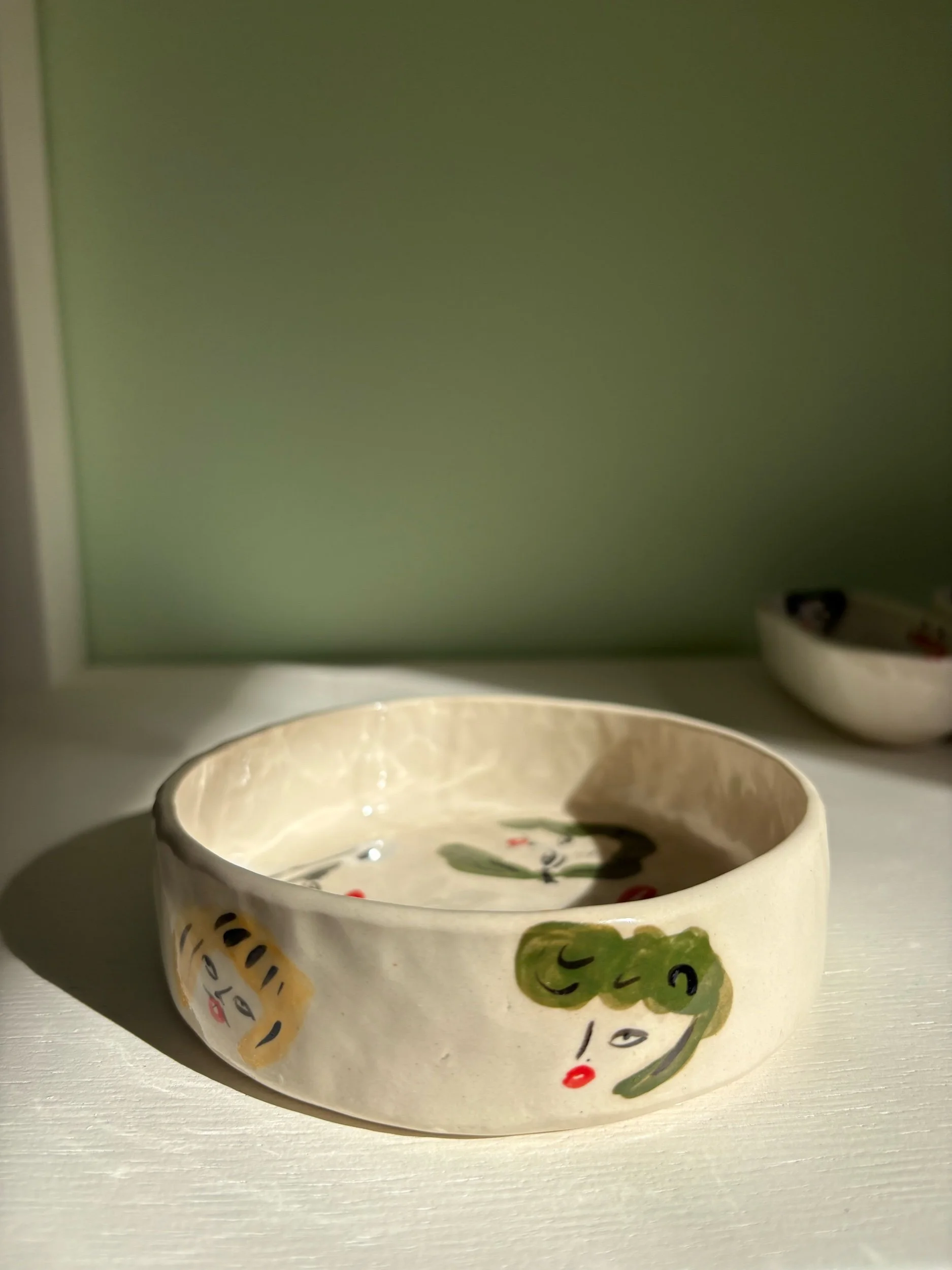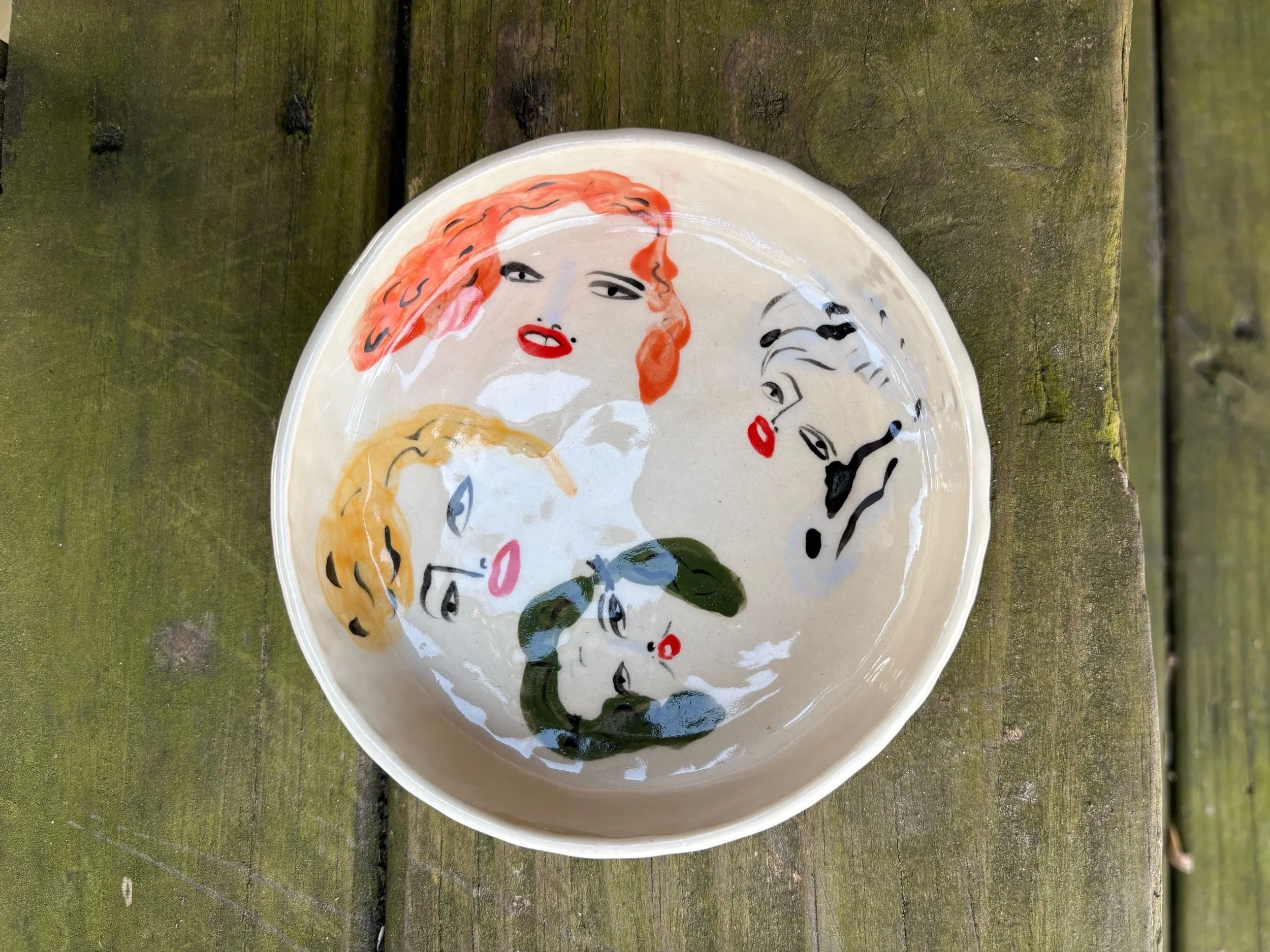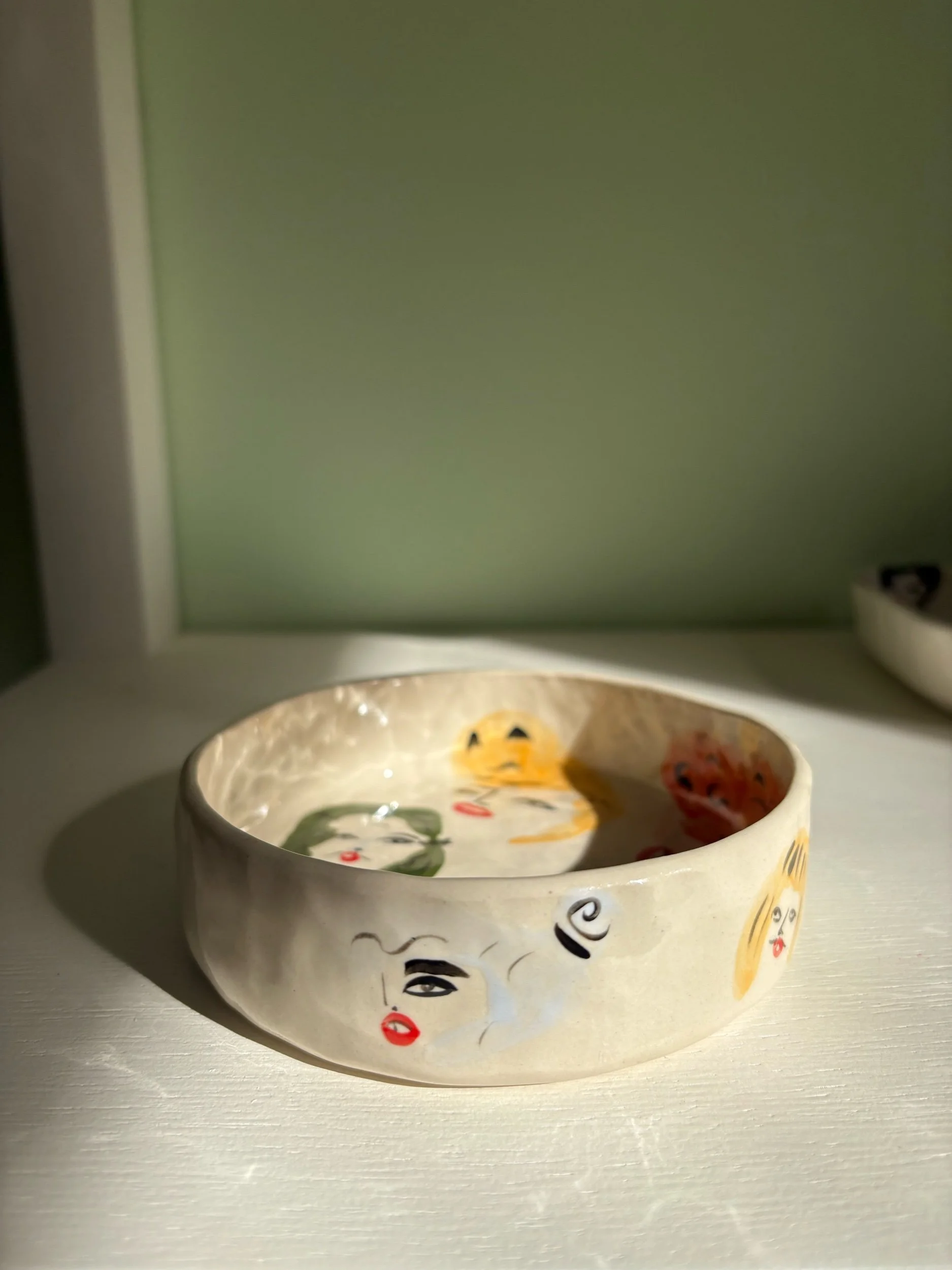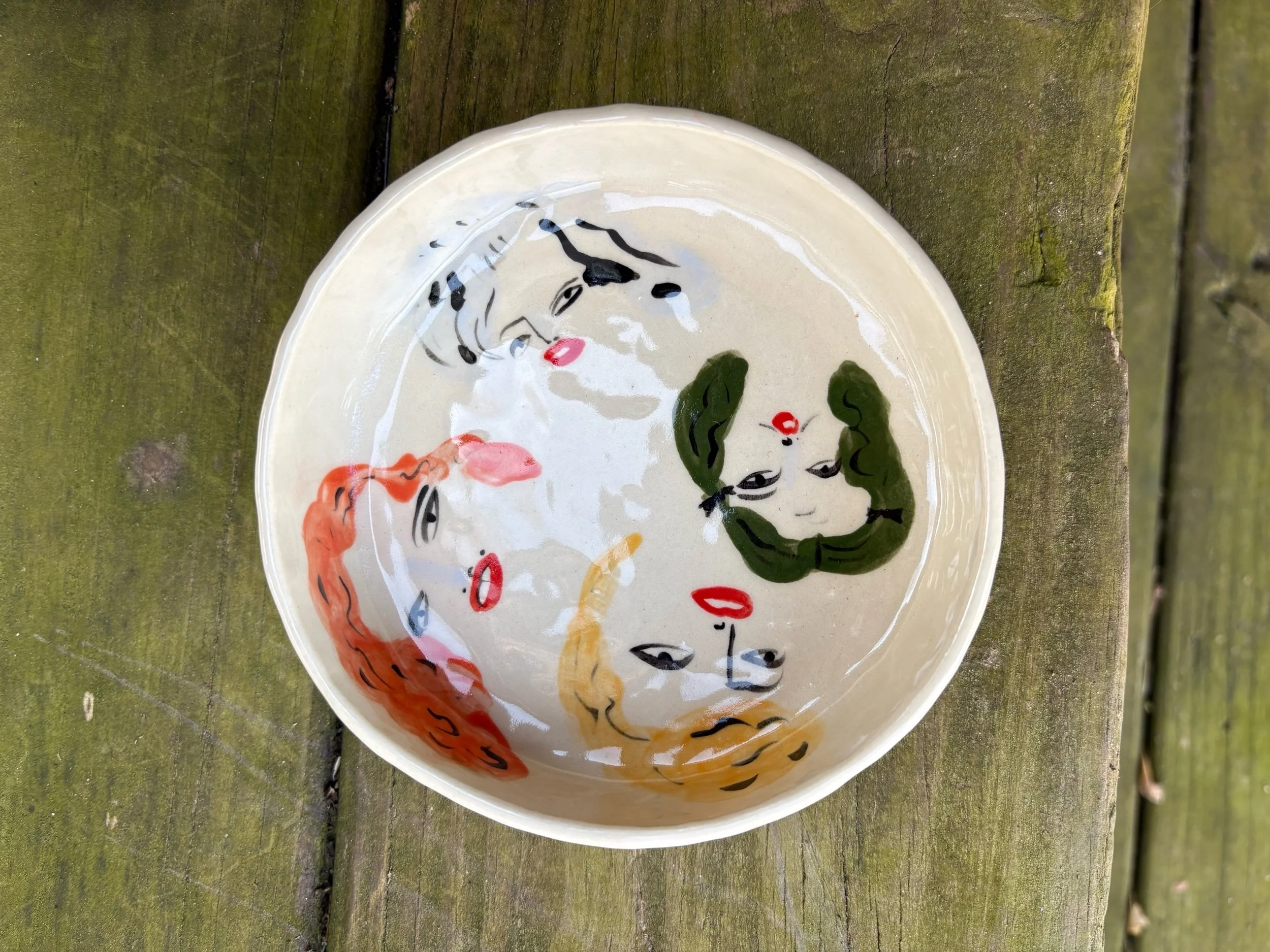 Hand pinched and painted fashionistas throughout. This dish is perfect for holding snacks and can be used as a wine coaster!